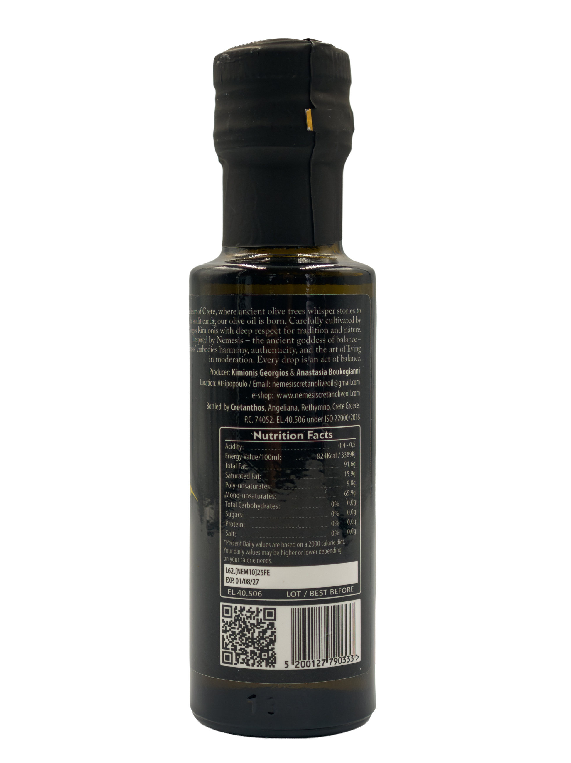 Έξτρα Παρθένο Ελαιόλαδο Nemesis – Γυάλινο Μπουκάλι 100ml Αυθεντικό. Κομψό. Έτοιμο για δώρο. Ανακαλύψτε την ουσία της Κρήτης σε ένα όμορφα μικρό γυάλινο μπουκάλι 100ml εξαιρετικού παρθένου ελαιολάδου Nemesis — ψυχρής έκθλιψης από ελιές που συλλέγονται με το χέρι και καλλιεργούνται σε ηλιόλουστο κρητικό έδαφος. Αυτό το μπουκάλι ταξιδιού είναι ασφαλές για αεροπλάνο, καθιστώντας το τον ιδανικό σύντροφο για τους λάτρεις των γκουρμέ εν κινήσει. Η γοητευτική και εκλεπτυσμένη εμφάνισή του το καθιστά επίσης ιδανικό για γαμήλιες μπομπονιέρες, δώρα βάπτισης ή κομψά δώρα εκδηλώσεων, προσφέροντας στους καλεσμένους μια γεύση ελληνικής παράδοσης τυλιγμένης σε κομψότητα. Με το ζωντανό πρασινοχρυσαφί χρώμα του, το φρέσκο άρωμα ελιάς και την απαλή, φρουτώδη γεύση του με μια διακριτική πιπεράτη επίγευση, το Nemesis φέρνει μια σταγόνα πολυτέλειας της φύσης σε κάθε τραπέζι — ή γιορτή.